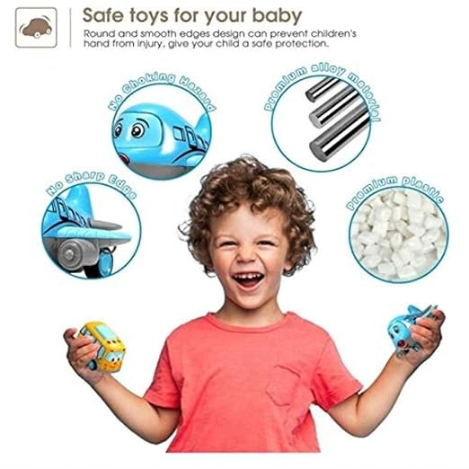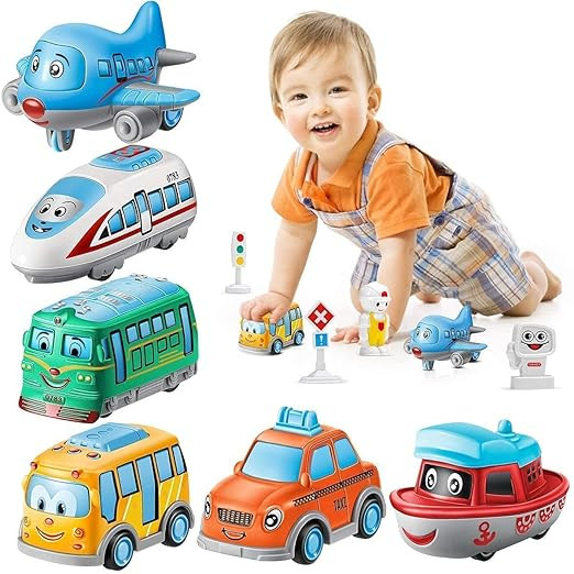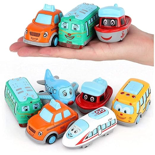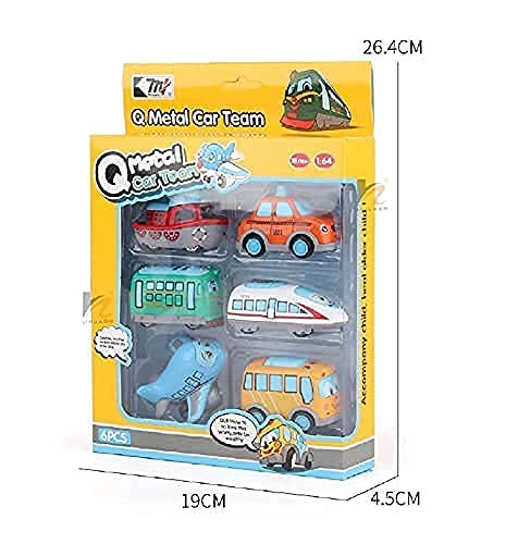 - SET OF 6 CARS: A recipe for hours of fun-filled imaginative fun! This set includes 6 metal cartoon car toys for kids in the cutest designs: bus, train, taxi, plane, ship, and tram. Each pullback toy measures 3” x 2.5” and is brought to life with vibrant colors.