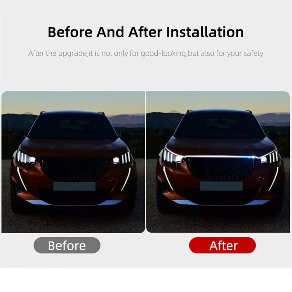 • 👍 EASY TO INSTALL – There is strong glue on the back of the light bar, which is soft and easy to bend. It can be attached to the gap of the hood without changing the wiring.