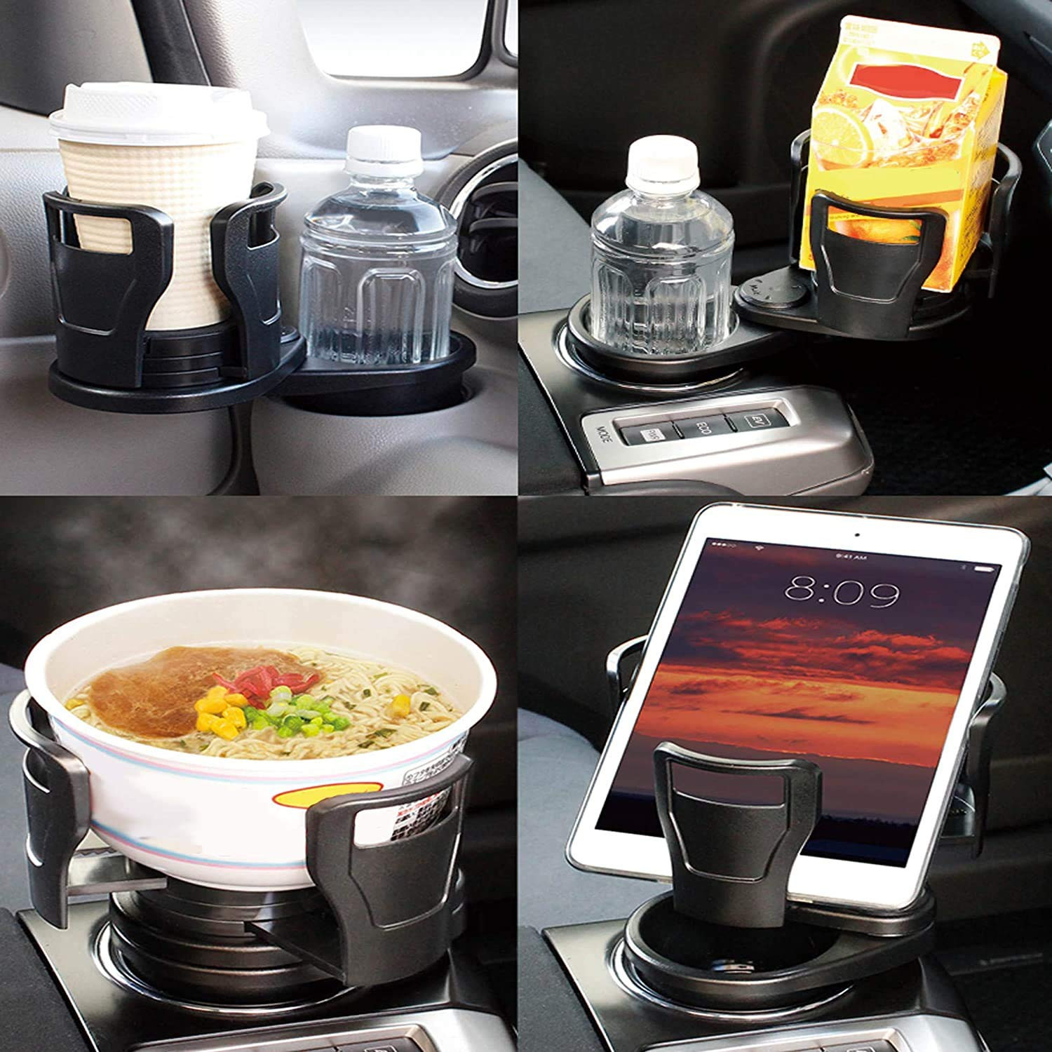 - [DOUBLE LAYER DESIGN CUP HOLDER]: Compact design with 2 storage space, one cup holder can accomadate 2 cups at same time. Upper cup holder is rotatable and expandable, not just can make it be more utility to more containters, but also makes it more convenient to storage. This universal detachable cup holder is suitable for soft drinks, canned drinks, mobile phones.