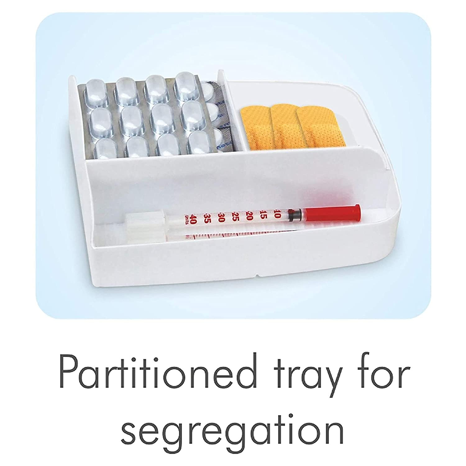 - The see-through lid which makes it easy for you to identify the contents easily even without opening the box. Additional partition helps segregate the equipment’s and Medicines so you can find the correct medicine at the time of emergency.