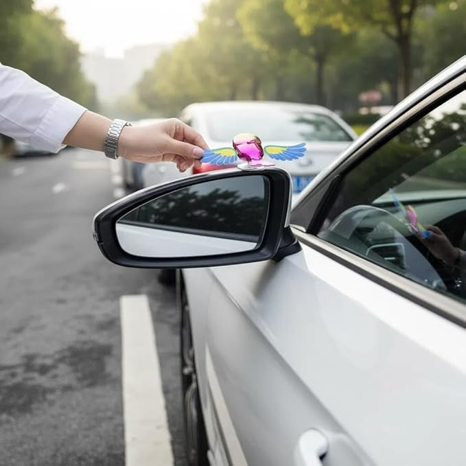 - Dynamic Flying Bird Design with Flapping Wings Watch our Fun Flaps Wings Flying Bird Car Sticker Decor come to life! This innovative fun flaps wings design features an internal mechanical structure. When your car reaches speeds over 25 km/h, the bird automatically starts flapping its wings and flying, creating an incredibly creative and eye-catching effect for your rearview mirror or other exterior spots.