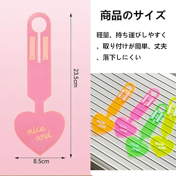 - Suitcase Tags: The appearance of this suitcase tag is a heart shape and fluorescent colors that are bright and easy to find your luggage from many suitcases