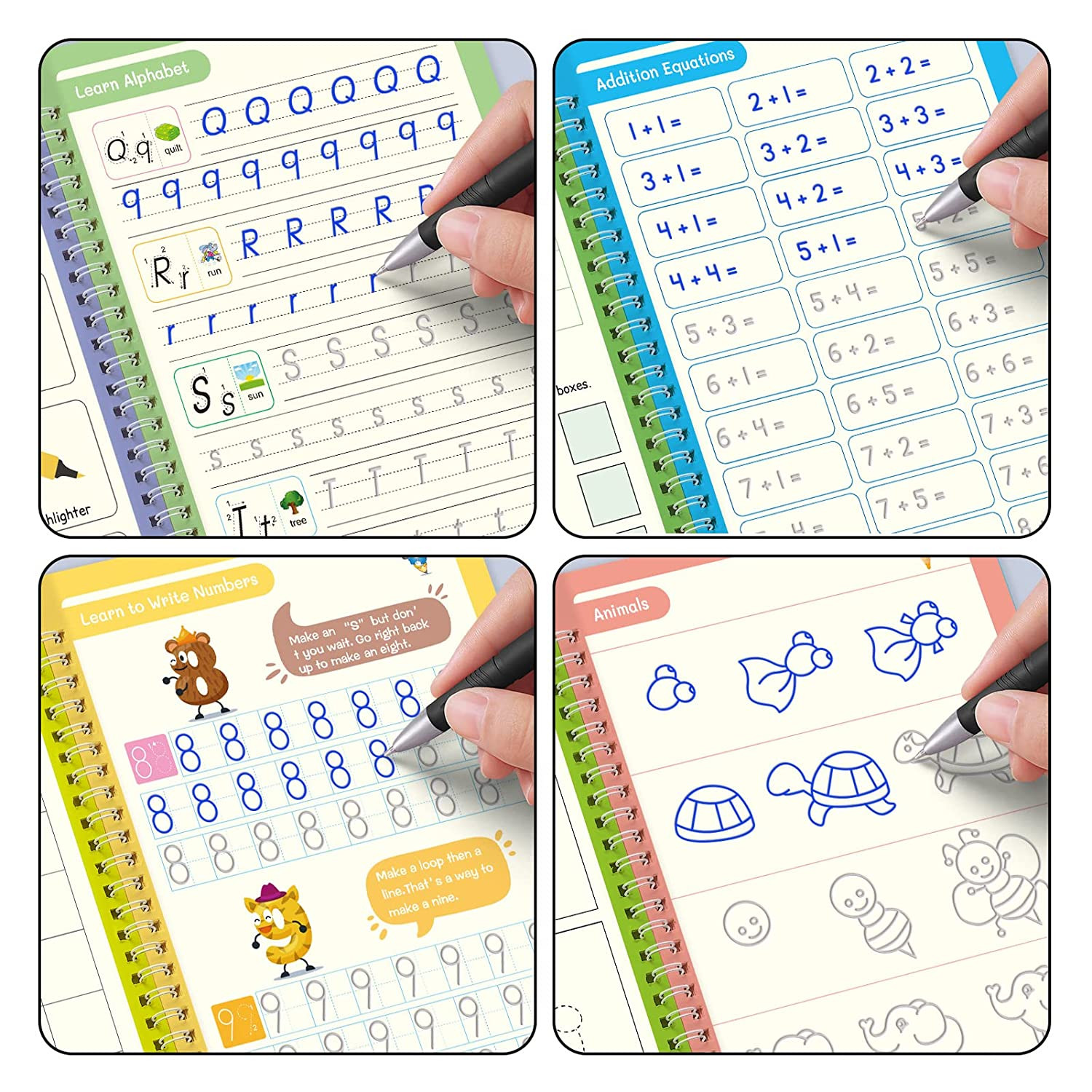 - 4 BOOK + 10 REFILL+ 1 Pen +1 Grip. Building basic skills helps your little ones learn their letters, numbers and pictures on every page. It is a great tool for developing fine motor skills and eye-hand coordination.