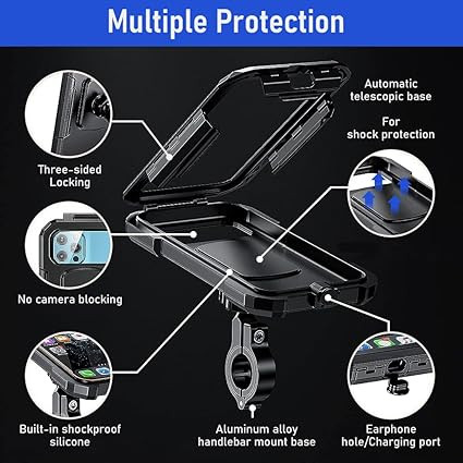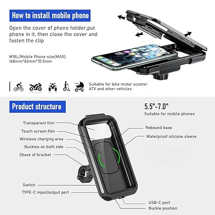 - HD TOUCH SCREEN COVER FOR EASY PHONE USAGE: The waterproof bike phone mount with HD high sensitive film window, allows you to fully access the phone screen without removing the smartphone. With the high-definition touch screen cover, you can seamlessly interact with your phone. This enables you to easily access navigation, change music or even answer calls while riding, enhancing both convenience and safety, fully enclosed design that can perfectly protect your phone in rainy days while riding.