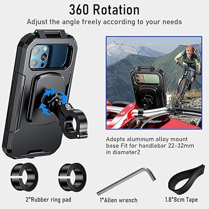 - 360 ° ROTATION DESIGN: 360 rotation mobile holder for bikes, you can adjust the angle of the bike phone holder freely. This phone holder for riding comes with an aluminum alloy installation base. Our mobile phone holder for motorcycle handlebars fits various vehicles with a handlebar diameter of 22mm to 32mm, including bicycles. 360 ° rotatable knob design allows you to effortlessly adjust the angle of your phone to your preference, ensuring easy access to your phone’s features while on the go.