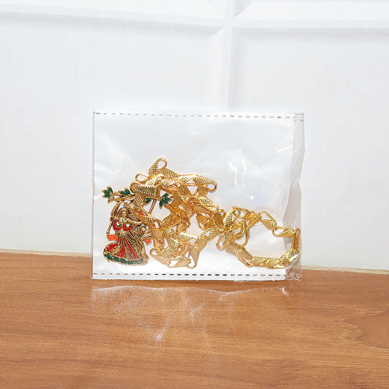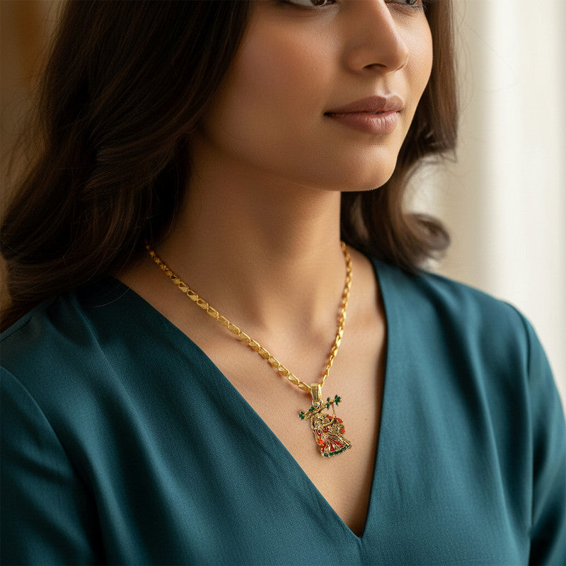 This Radha Krishna devotional pendant with designer chain beautifully represents divine love, harmony, and spiritual connection. The pendant features an elegant depiction of Radha and Krishna, crafted with fine detailing that enhances its traditional and artistic appeal. Paired with a stylish chain, it is suitable for daily wear as well as festive and religious occasions. The graceful design complements ethnic outfits while also adding a subtle spiritual touch to modern attire. Ideal for devotees, this pendant chain makes a meaningful gift for festivals, celebrations, and special spiritual moments.