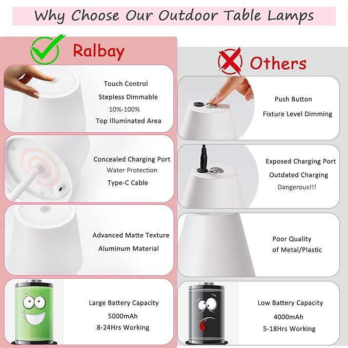 - 2* IP54 Waterproof outdoor&Indoor Table Lamp : The materials of this cordless outdoor table lamp adopt Die-casting metal aluminum. ensure the long service life of our table lamp. Meanwhile, IP54 protection level tech and unique drainage shape, no need to worry about water ingress, it can be applied to various outdoor situations. (Don’t submerge the whole table lamp into water.)