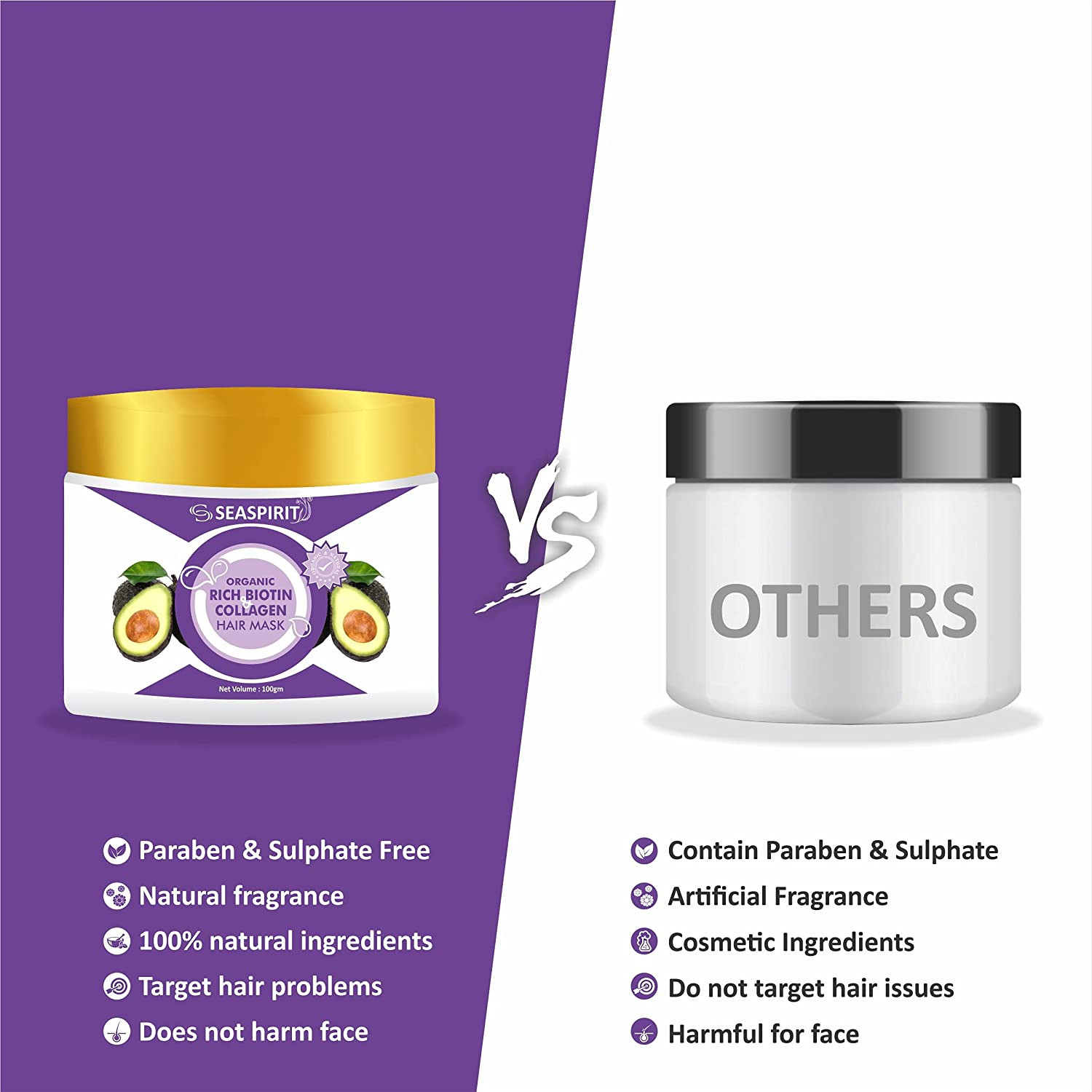 - The Hair Mask contains Biotin that helps improve the overall hair quality, thickness, & shine. Collagen forms a protective film on the strands and makes hair smooth. It helps reduce hair breakage.