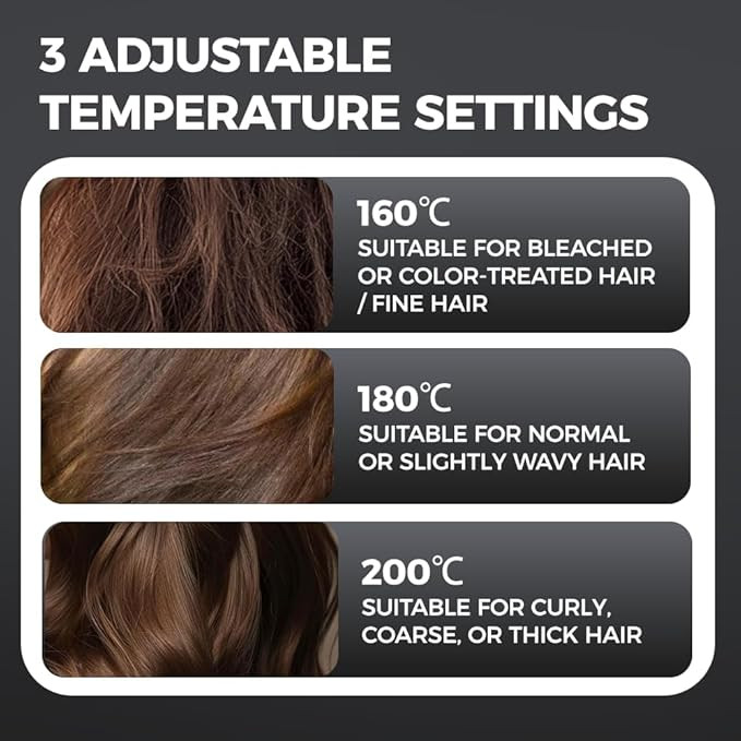 - Temperature control structure – Three level temperature regulation indicated on product visuals for adjustable heat setting selection.