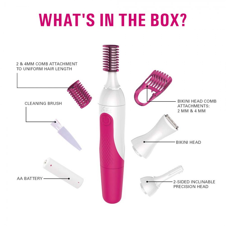 - Wide Range of Accessories: precision head, bikini head, comb, beauty cap, cleaning brush, beauty pouch and AA battery