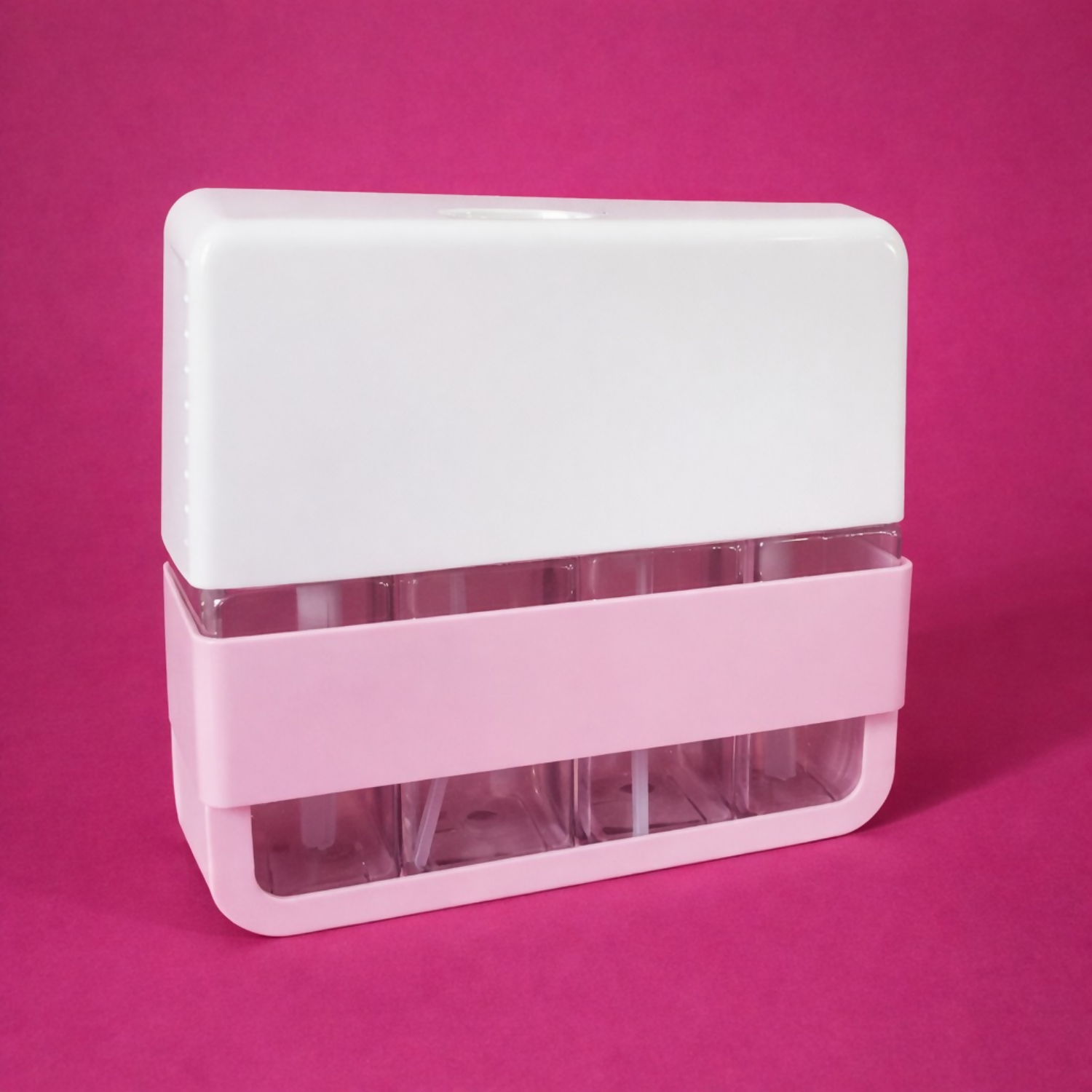 This Sub-Bottle Dispenser Set is a practical solution for carrying your daily essentials while traveling or organizing your vanity. The compact holder securely stores multiple refillable pump and spray bottles, keeping liquids neatly arranged and easy to access.