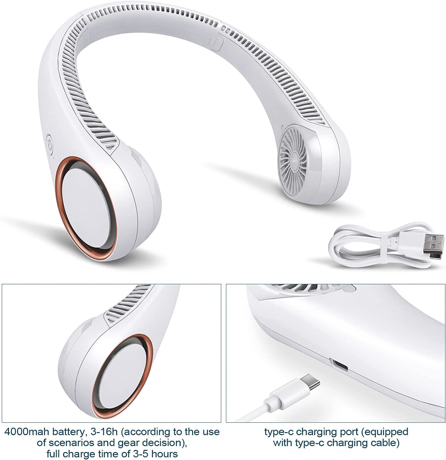 - [Upgrade Design Neck Fan, Free Your Hands] The upgrade bladeless design makes the fan light and fashionable which like a cool headphone. This portable neck fan has many patents, including the unique appearance, the way to generate wind, the wind outlets etc.